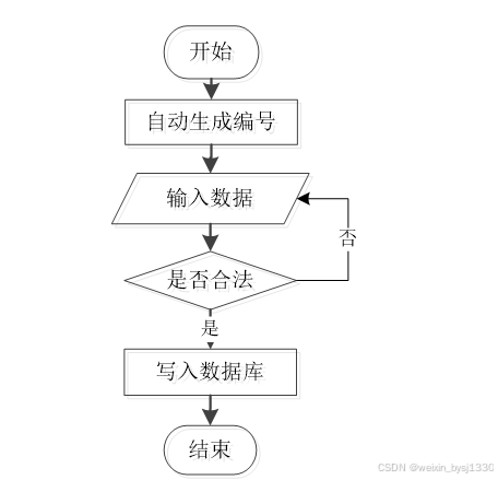 添加信息,编号系统使用自动编号模式,没有用户填写,用户添加信息输入信息,系统将自动确认的信息和数据,验证的成功是有效的信息添加到数据库,信息无效,重新输入信息。添加信息流程如图3-3所示。
