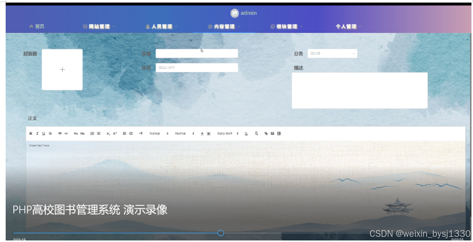 管理员在图书资讯这一栏查看标签、标题、分类、描述封面图书等详细信息。可根据需要进行查询、重置、添加删除等相应的操作。