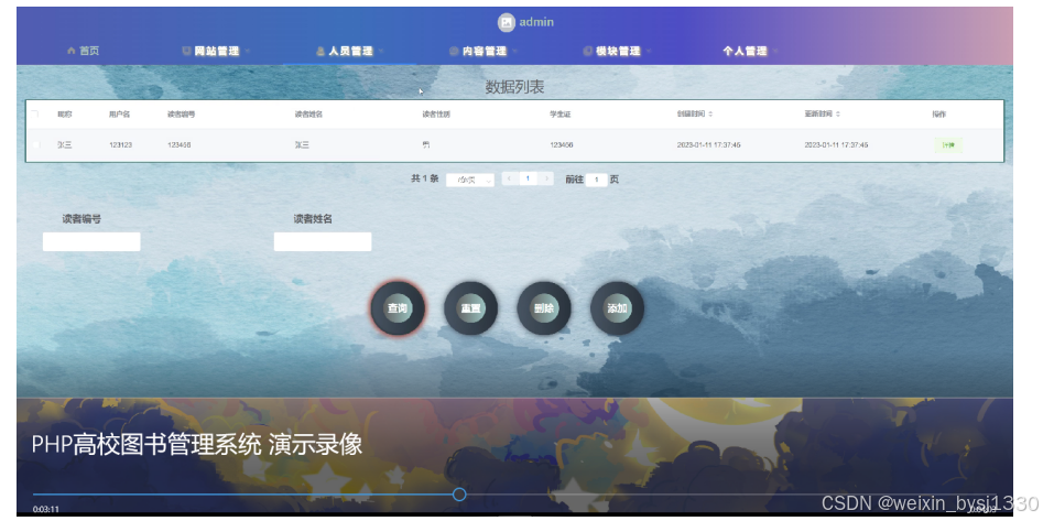 管理员对系统用户的管理,在管理员管理实现管理员用户的管理,包括录入、删除、修改,修改密码通过SESSION获取用户名,然后输入新密码,使用sql命令更新密码。
