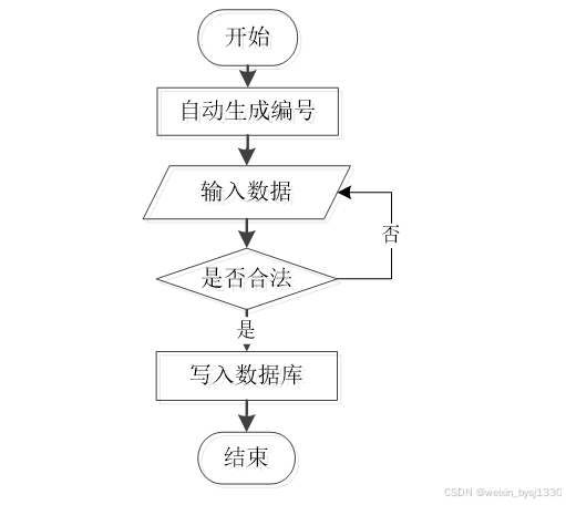 用户成功登入系统后就能够实现增加数据的操作,增加数据的编号是特定的,系统生成,用户不能随意填写,除了编号以外,其他增加信息用户自己填写,填写后的信息经过系统验证,验证合法通过就显示增加数据成功了,相反的话,就没有增加成功,图2-1显示的就是在增加数据时的流程。