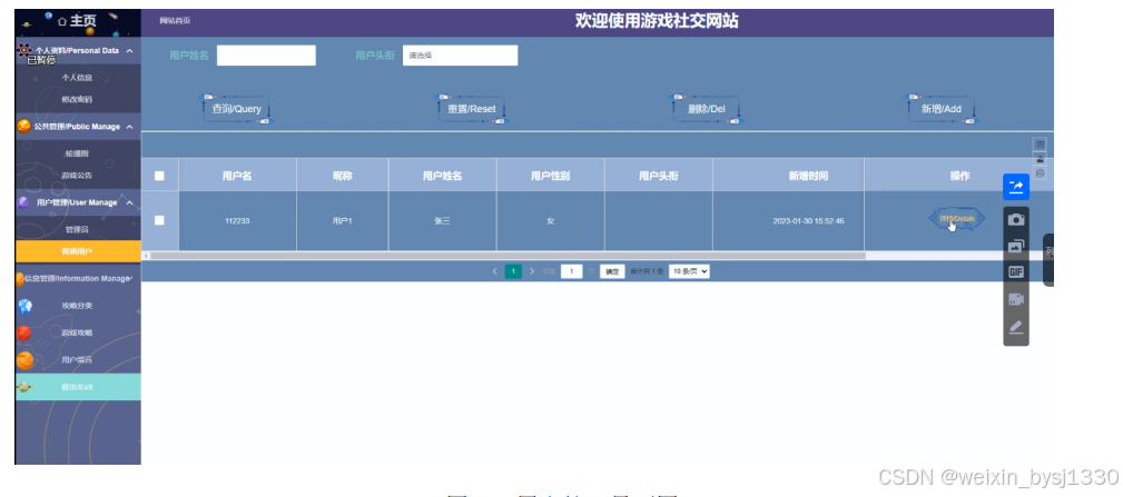 游戏社交网站中的管理人员是可以对前台注册的用户进行管理的,也可以对管理员进行管控。界面如下图4-8所示。