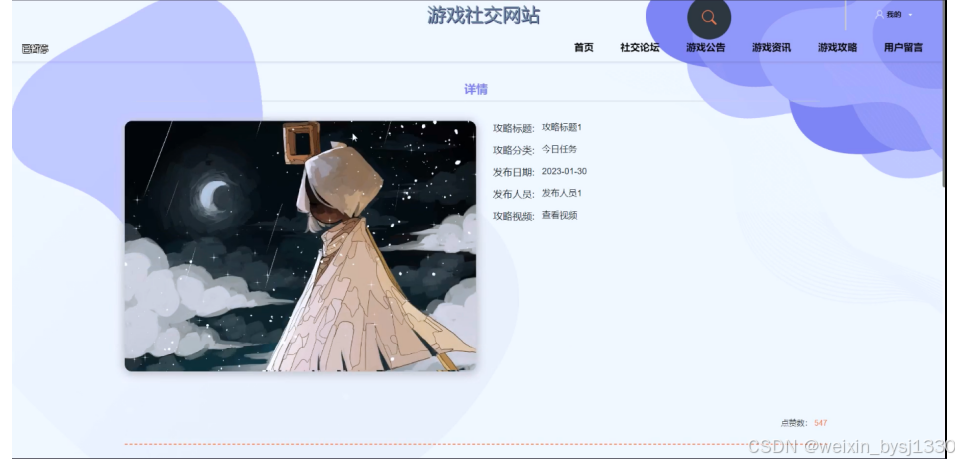 当访客点击了任意游戏攻略后将会进入该攻略的详情界面,可以了解到该游戏攻略的攻略标题、攻略分类、发布日期、发布人员、攻略视频等,同时可以对该游戏攻略进行收藏+点赞+评论,游戏攻略详情展示页面如图4-6所示。