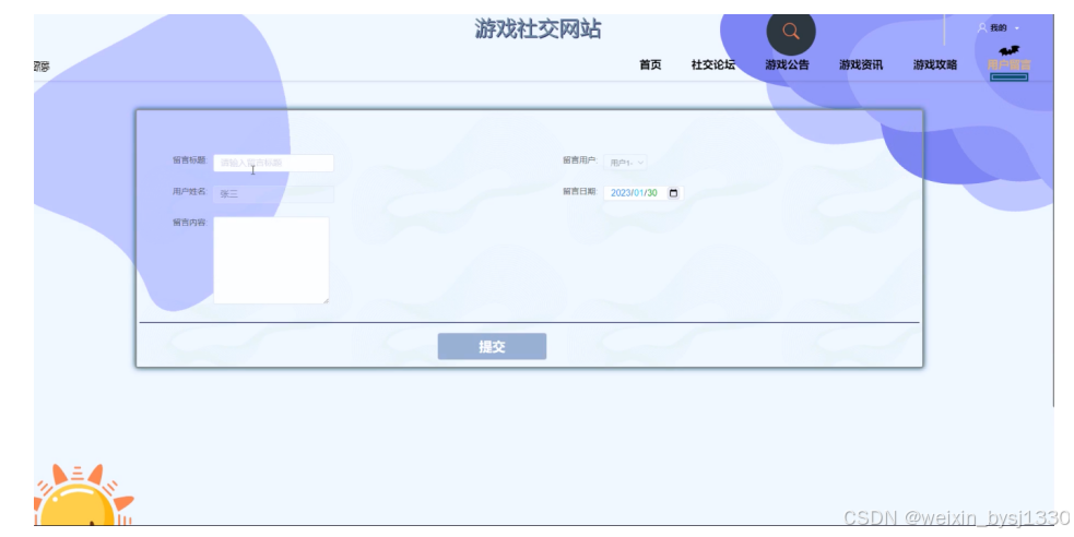 点击导航栏上的“用户留言”,可以选择留言类型,留言标题、留言内容、用户姓名、留言用户、留言日期,然后点击“提交”按钮进行提交用户留言,用户留言界面如下图4-5所示。