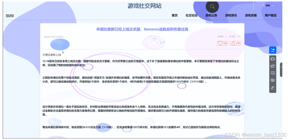 (4)游戏资讯:在首页导航栏上我们会看到“游戏资讯”这一菜单,我们点击进入进去以后,会看到所有管理员在后台发布的游戏资讯信息,能够对喜欢的游戏资讯进行点赞,如果下次想要更快的找到这篇资讯,也可以进行收藏、评论;