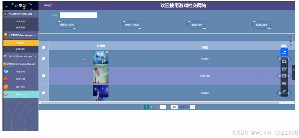 (2)公共管理:当点击“公共管理”这一菜单的时候,会出现游戏公告+轮播图这两个子菜单,可以对这两个模块进行增删改查操作;