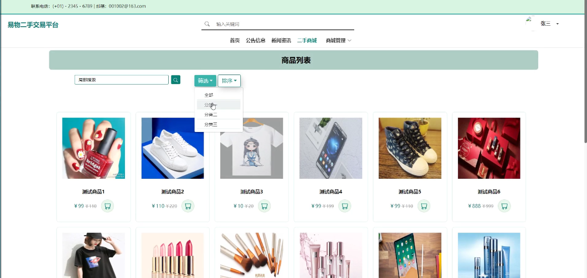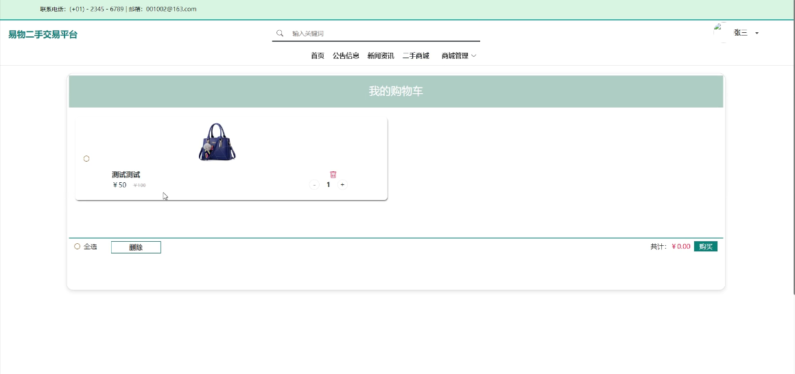 - 二手商城:注册用户点击“新闻资讯”可查看管理员发布的所有二手商城,支持局部搜索和下拉(筛选、排序)搜索,热门商品推荐,点击可查看详情,进行收藏=,并可点击立即购买(订单备注、支付)和加入购物车操作。