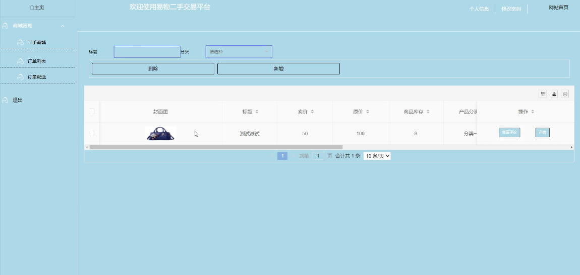 - 商城管理:管理员点击“商城管理”可对二手商城、分类列表、订单列表、订单配送等信息进行管理。点击“二手商城”,可查看所有二手商城信息,进行增删改查操作,支持标题、分类搜索,可点击详情进行查看和查看评论;点击“分类列表”,可查看所有分类信息,进行增删改查操作,支持分类搜索,可点击详情进行查看;点击“订单列表”,可查看所有订单信息,进行查询和删除操作,支持订单号、商品名称、联系人姓名、状态搜索,可点击详情进行查看,和点击进行配送操作;点击“订单配送”,可查看所有订单配送信息,进行查询和删除操作,支持配送状态、签收状态搜索,可点击详情进行查看(订单号、商品名称、购买数量、交易总额、发货日期、配送单号、联系人、买家、收货地址、配送状态、签收状态),可点击签收,修改签收状态。