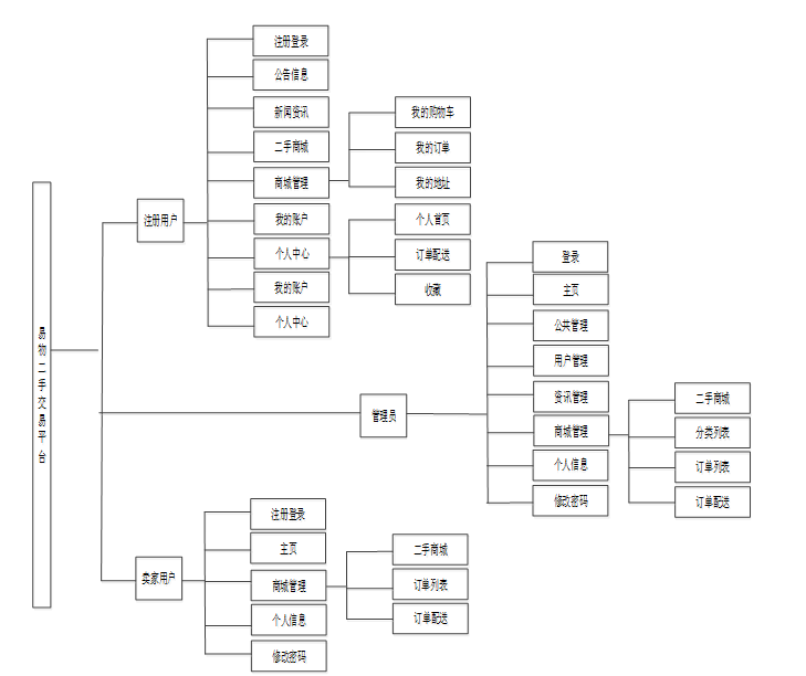 根据易物二手交易平台功能需求分析,主要划分为了注册用户模块和管理员模块这两大部分,以上模块又细分小功能模块。具体如下: