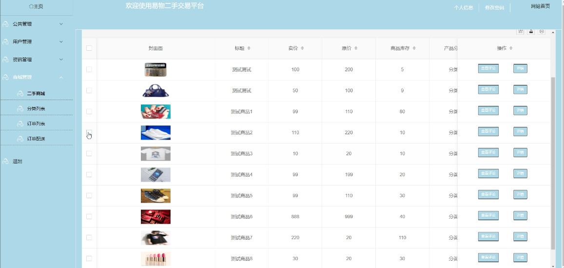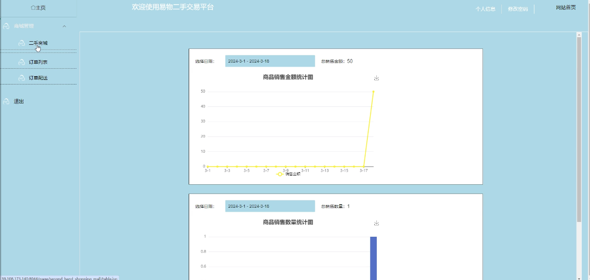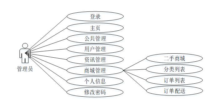 管理员模块主要负责公共管理、用户管理、资讯管理、商城管理(二手商城、分类列表、订单列表、订单配送)等系统信息管理,包括可进行增删等操作,能够查看主页的商品销售金额统计、商品销售数量统计等数据分析图表,并可以修改个人信息和修改密码。