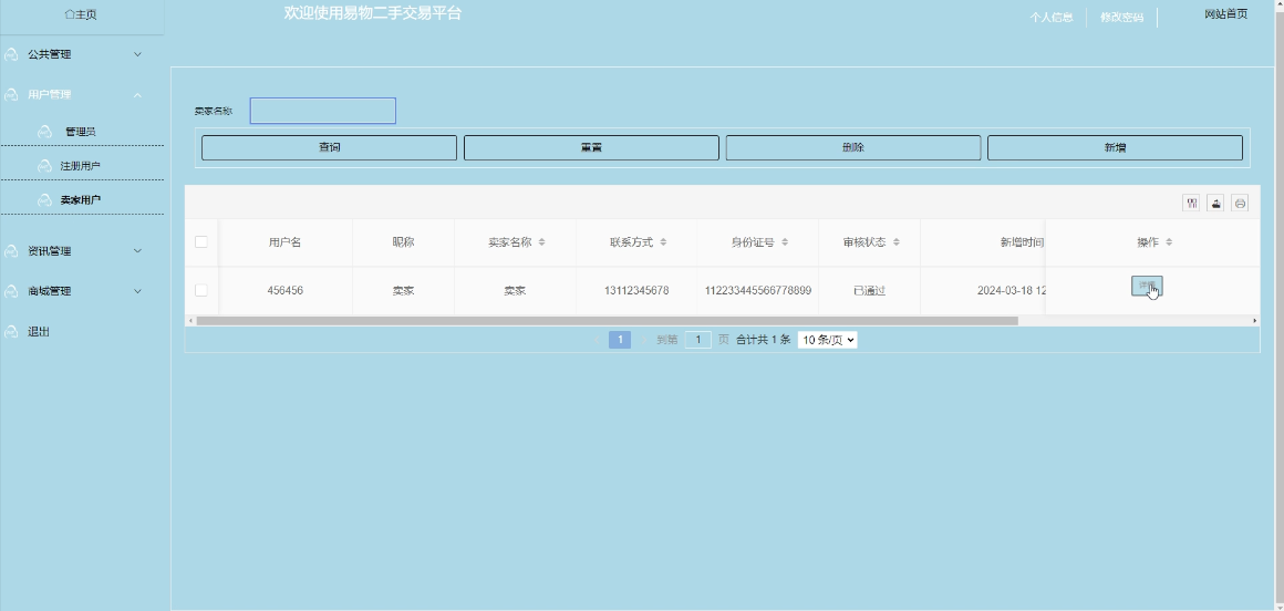 - 用户管理:管理员点击“用户管理”可对注册用户、卖家用户和管理员进行管控,包括进行增删改查操作,点击可查看详情,卖家用户注册信息需经过管理员审核才可登录。