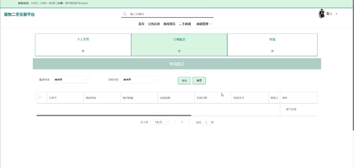 - 个人中心:注册用户点击“个人中心”可对个人首页、订单配送、收藏等信息进行管控。点击“订单配送”,可查看订单配送信息,进行查询操作,支持配送状态、签收状态搜索,可点击详情进行查看,和进行签收操作;点击“收藏”,可管理所有收藏信息,包括新闻资讯、二手商城等,进行查看和删除操作。可点击详情进行查看。