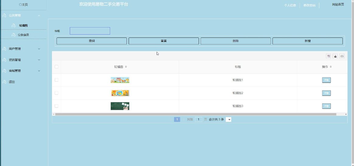 - 公共管理:管理员点击“公共管理”可对首页的轮播图和通知公告进行管理,进行增删改查操作,支持标题搜索,可点击查看详情。
