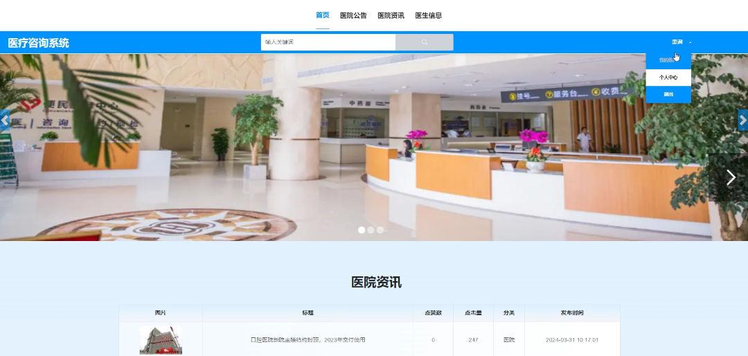 - 首页:患者用户可查看轮播图、医院资讯、医生信息推荐和使用系统其他功能。