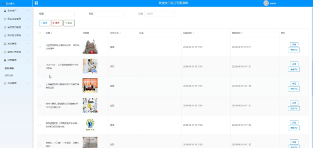 - 资源管理:管理员可对医院资讯和资讯分类进行管理,进行增删改查操作,医院资讯支持标题、标签、分类搜索,可点击查看详情和查看评论;资讯分类支持类型名称搜索,可点击查看详情。