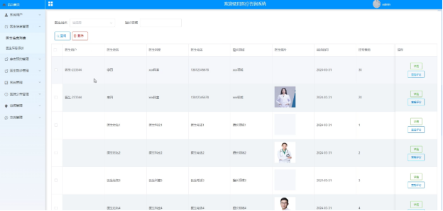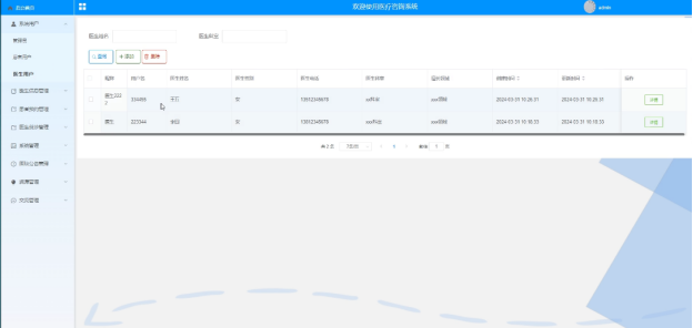 - 系统用户:管理员可对患者用户、医生用户和管理员进行管控,包括进行增删改查操作,点击可查看详情,医生用户账号信息由管理员添加。