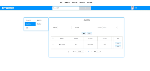 - 个人中心:医生用户可对个人首页、医生信息、患者预约、医生就诊、收藏等信息进行管控。点击“医生信息管理”,可查看自己的医生信息,进行增改删查操作,支持医生姓名、擅长领域搜索,点击可查看详情和查看评论;点击“患者预约”,可查看自己的患者预约信息,进行查询操作,支持患者姓名、医生姓名、支付状态搜索,可点击查看详情,并可点击就诊操作;点击“医生就诊”,可查看自己的医生就诊信息,进行增改删除操作,支持建档时间、医生姓名、就诊结果、支付状态搜索,可点击查看详情并可点击支付操作;点击“收藏”,可管理所有收藏信息,包括交流学习医院资讯、医生信息等收藏信息,进行查看和删除操作,点击可查看详情