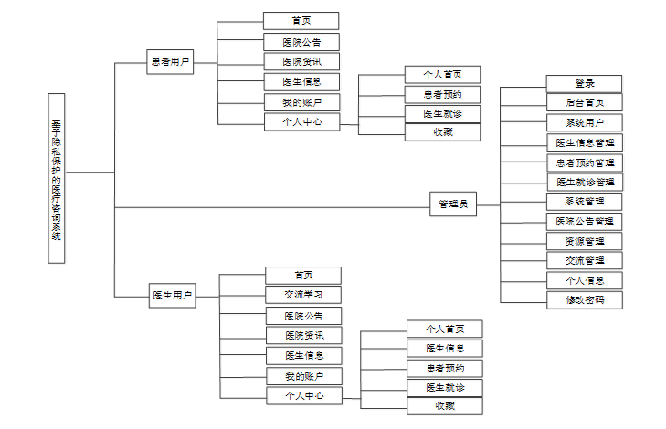 根据基于隐私保护的医疗咨询系统的需求分析,主要可以划分为了患者用户模块、医生用户模块和管理员模块这三大部分,以上模块又细分成小功能模块,具体说明如下。