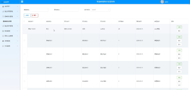 - 患者预约管理:管理员可查看所有患者预约信息,进行查询和删除操作,支持患者姓名、医生姓名、支付状态搜索,点击可查看详情(患者用户、患者姓名、医生用户、医生姓名、医生科室、挂号费用、预约时间、病情描述、患者病历),可并点击就诊和支付操作。
