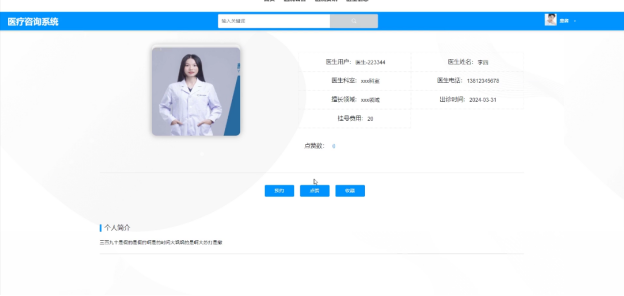 - 医生信息:患者用户可查看所有医生信息,支持医生姓名、擅长领域搜索,点击可查看详情,进行点赞、收藏和评论,并可点击预约操作。