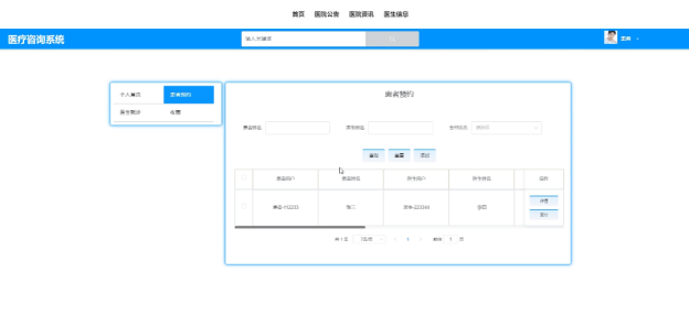 点击“患者预约”,可查看自己的患者预约信息,进行增改删查操作,支持患者姓名、医生姓名、支付状态搜索,可点击查看详情,并可点击支付(微信、支付宝、网银)操作;点击“医生就诊”,可查看自己的医生就诊信息,进行查询和删除操作,支持建档时间、医生姓名、就诊结果、支付状态搜索,可点击查看详情,并可点击支付操作;