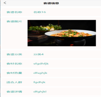 (4)食谱信息:注册用户点击“食谱信息”菜单可以查看所有食谱信息,可以按照条件查看食谱信息,或者输入关键词进行查询,点击可以进入食谱信息详细展示界面。