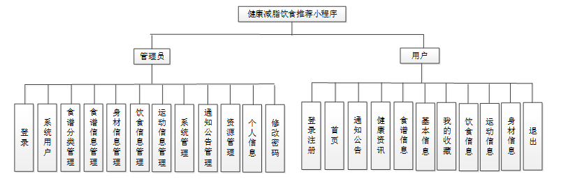 健康减脂饮食推荐小程序我划分为了注册用户管理模块和管理员模块这两大部分。