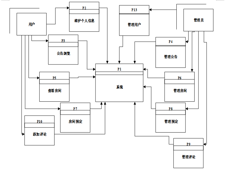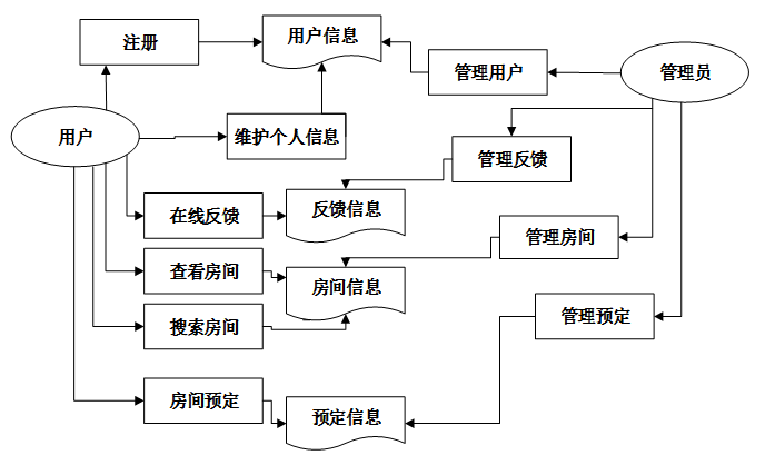 经过对系统功能的分析,调查,研究,总结出酒店预订管理系统主要实现的是对反馈信息、用户信息等管理功能。这样,可以对该系统绘制业务流程图。
