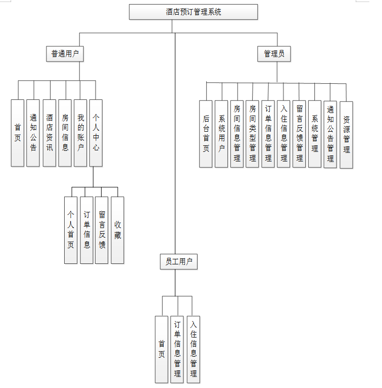 酒店预订管理系统的功能主要分为普通用户、员工用户和管理员。主要功能如下: