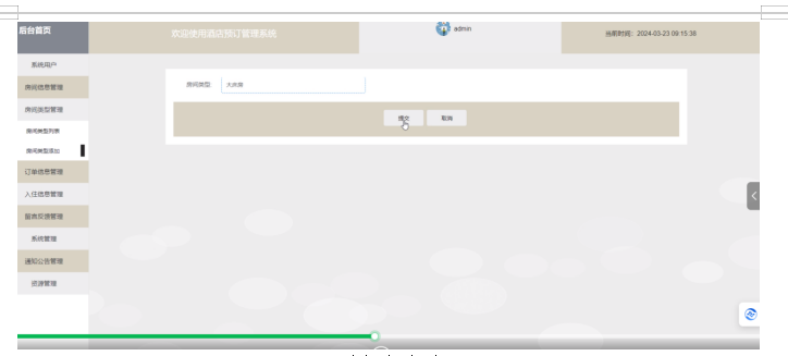 当想要添加房间类型时,操作时通过JS控制打开房间类型管理的二级菜单,输入要入添加的房间类型,既可以完成添加操作,入库后,该房间类型马上增加。