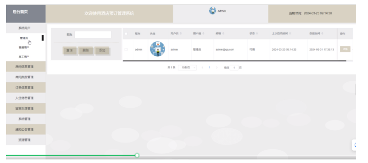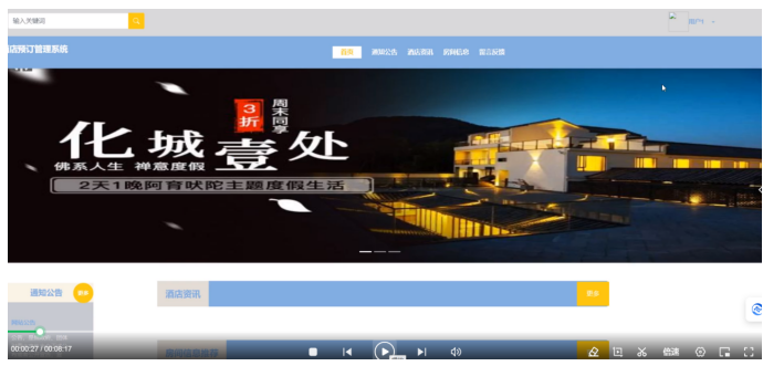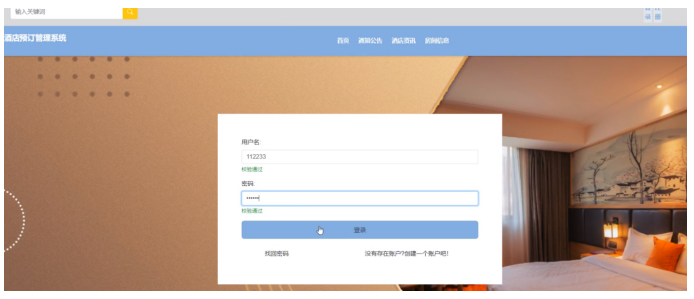 首页:一旦登录成功,普通用户应该能够进入系统的首页,获取最新的通知公告、酒店资讯和热门房间信息。