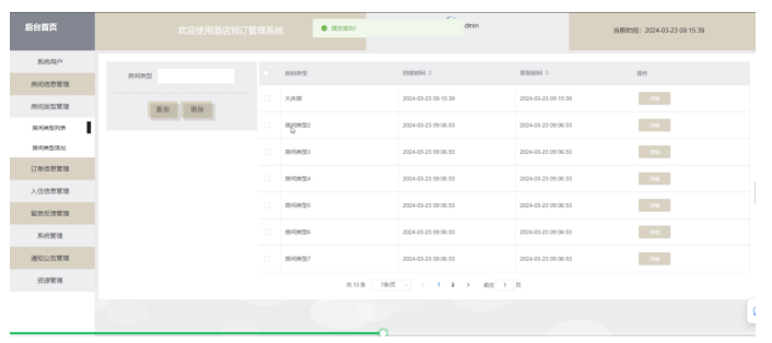 房间类型管理:管理员可以管理系统中的房间类型信息,包括添加新的房间类型、编辑已有类型信息、下架不再提供的类型等。