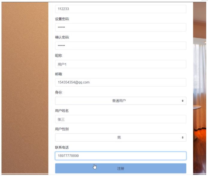 用户在填写数据的时候必须与注册页面上的验证相匹配否则会注册失败,注册页面的表单验证是通过JavaScript进行验证的,用户名的长度必须在6到18之间,邮箱必须带有@符号,密码和密码确认必须相同,你输入的密码,系统会根据你输入密码的强度给出指定的值,电话号码和身份证号码必须要求输入格式与生活相符合,当你前台验证通过的时候你点击注册,表单会将你输入的值通过name值传递给后台并保存到数据库中。