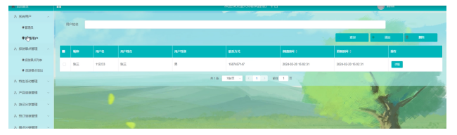 用户通过注册了方可获得登录使用权限,此时选择普通用户选项,系统就会自动转到用户注册工作面,在注册该部分信息时系统会自动调用add函数,然后在给定的文本框中填写有关该用户的基础信息后选择确认即可完成注册。检索用户信息,在新增用户信息以后,在检索工具栏中填写对应的用户信息,系统就会将该用户有关的所有信息展示出来。