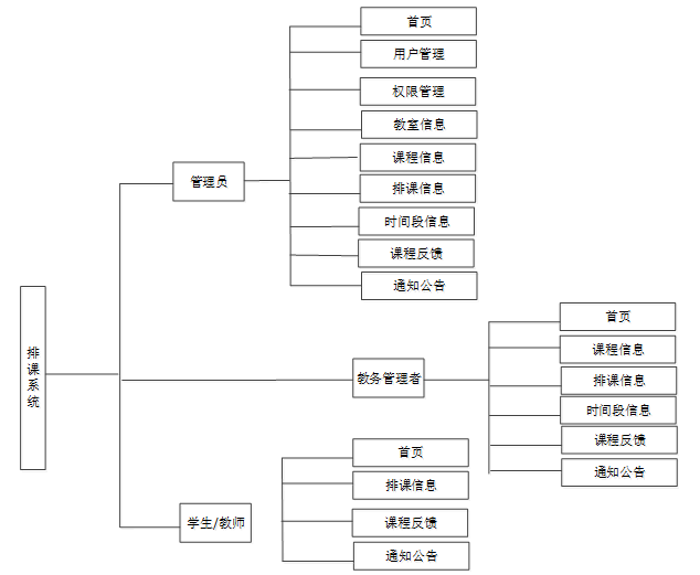 排课系统从角色上划分为了管理员、学生用户、教师用户、教务管理者四种角色。