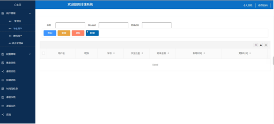 (2)系统用户:当点击“系统用户”这一菜单的时候,会出现管理员、学生用户、教师用户、教务管理者四个子菜单,可以对这四个模块进行增删改查操作;
