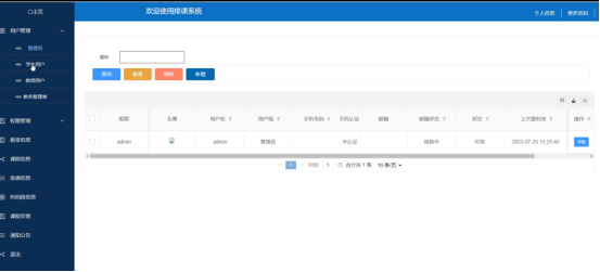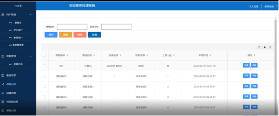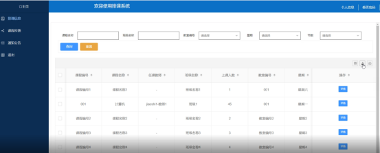 当点击“排课信息”这一菜单的时候,管理员对排课信息进行管控;其界面展示如下图4.6所示。
