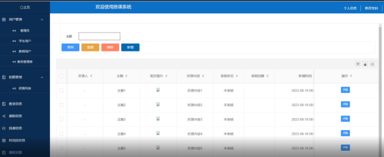 (8)课程反馈:当点击“课程反馈”这一菜单的时候,管理员对课程反馈进行审核回复,同时支持对课程反馈信息进行增删改查;