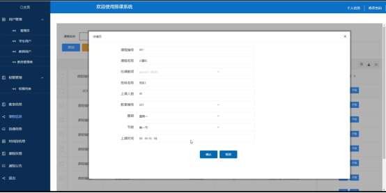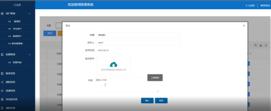 当点击“课程信息”这一菜单的时候,教务管理者对课程信息进行排课添加,包含课程编号、课程名称、任课教师、班级名称、上课人数、教室编号、星期、节数、上课时间。其界面展示如下图4.4所示。