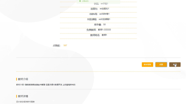 当用户点击了任意教材后将会进入该款教材的详情界面,可以了解到该教材的介绍、详情等,同时可以对该教材进行教材领取+点赞+收藏+评论,教材详情展示页面如图4-6所示。