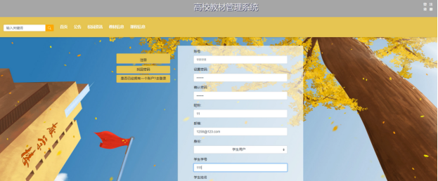不是高校教材管理系统中用户的是可以在线进行注册的,当填写上自己的账号、密码、昵称、邮箱、身份再点击“注册”按钮后将会先验证输入的有没有空数据,再次验证密码和确认密码是否是一样的,最后验证输入的账户名和数据库表中已经注册的账户名是否重复,只有都验证没问题后即可注册成功。其用注册界面展示如下图4-2所示。