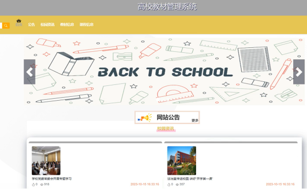 在高校教材管理系统的前台首页界面上采用了上+中+下的方式来布局界面,最右上角是登录+注册这两个链接,下面依次是导航栏+轮播图以及下面的公告栏,下面依次是推荐的教材展示,其主界面展示如下图4-1所示。