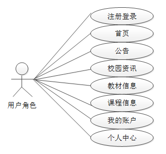 高校教材管理系统的完整UML用例图分别是图2-1和图2-2。在参与者上包括用户以及管理员。前台上用户角色用例包括用户是注册用户、用户登录、首页、公告、校园资讯、教材信息、课程信息、我的账户、个人中心,用户角色用例如图2-1所示。