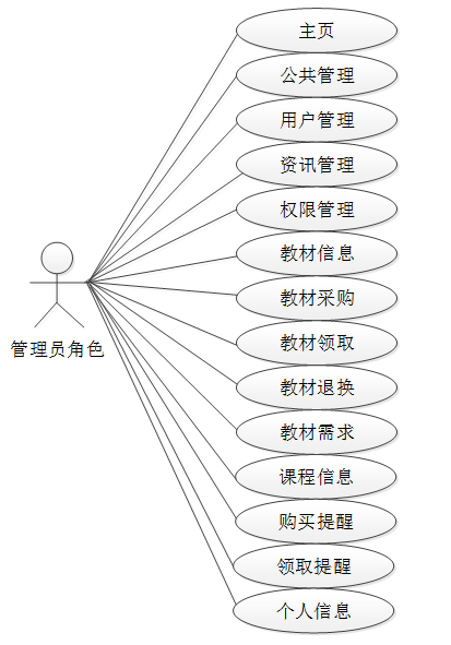 web后台管理上的管理员是维护整个高校教材管理系统中所有数据信息的,管理员可以进行主页、公共管理、用户管理、资讯管理、权限管理、教材信息、教材采购、教材领取、教材退换、教材需求、课程信息、购买提醒、领取提醒、个人信息。管理员角色用例如图2-2所示。