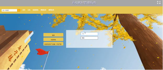高校教材管理系统中的前台上注册后的用户是可以通过自己的账户名和密码进行登录的,当用户输入完整的自己的账户名和密码信息并点击“登录”按钮后,将会首先验证输入的有没有空数据,再次验证输入的账户名+密码和数据库中当前保存的用户信息是否一致,只有在一致后将会登录成功并自动跳转到高校教材管理系统的首页中;否则将会提示相应错误信息,用户登录界面如下图4-3所示。