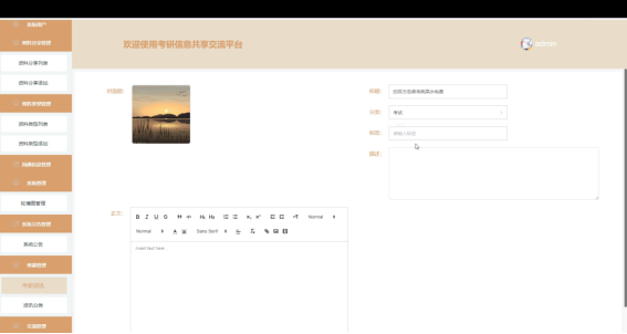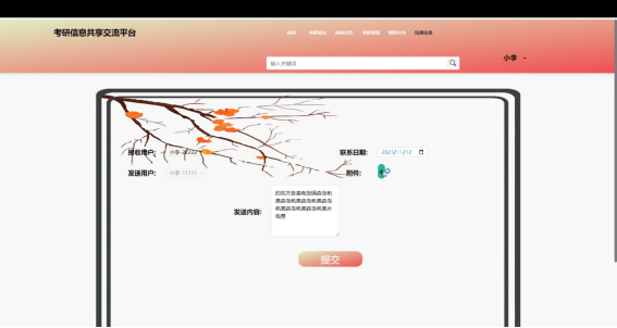 This system is developed with practical application as the background. Through the system administrator, it is possible to uniformly manage system users, postgraduate entrance examination information, shared data, and other information, facilitating the retention of data. Users share information and communicate with each other. Overall, the system is developed using the Java language, the backend uses the SpringBoot framework, and the database uses MYSQL.