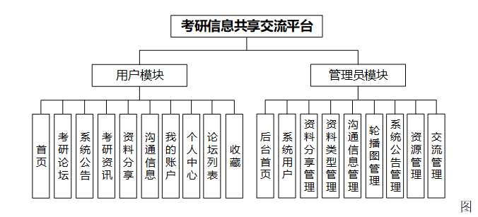 考研信息共享交流平台的设计与实现是为了让系统管理员可以对系统用户、资料分享、沟通交流信息、论坛等进行统一的管理。用户可以互相分享资料、沟通交流。具体如下: