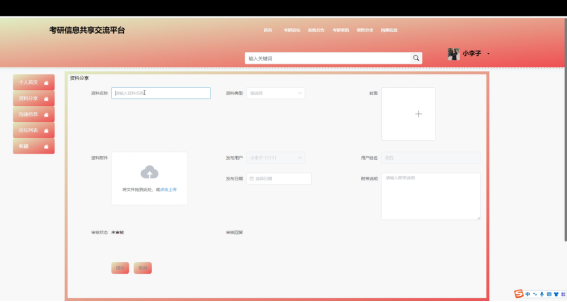 用户在个人后台点击“资料分享”这个菜单,可以查看到系统中所有用户分享得资料,支持通过资料名称、类型、用户姓名等关键词进行查询,如果想要了解某一资料的详细信息,点击后面的“详情”会进入详情查看界面; 用户在后台进入“资料分享”菜单,填写完整信息、上传资料后提交,待管理员审核通过后可以将资料分享出去。界面如下图4.5所示。