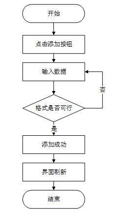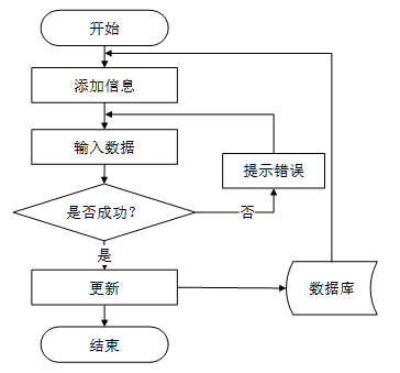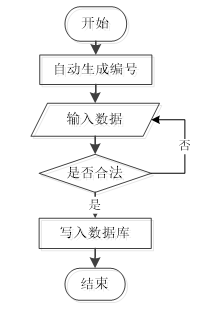用户成功登入系统后就能够实现增加数据的操作,增加数据的编号是特定的,系统生成,用户不能随意填写,除了编号以外,其他增加信息用户自己填写,填写后的信息经过系统验证,验证合法通过就显示增加数据成功了,相反的话,就没有增加成功,图2-1显示的就是在增加数据时的流程。