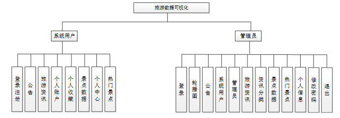 旅游数据可视化整体的功能模块包括管理员这个模块,实现了对景点数据相关信息的查询管理,系统功能模块如图所示。