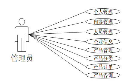系统中的核心用户是系统管理员,管理员登录后,通过管理员菜单来管理后台系统。主要功能有:首页、人员管理、企业信息、产品管理、产品分类、产品订单、产品咨询等功能。管理员用例如图3-7所示。